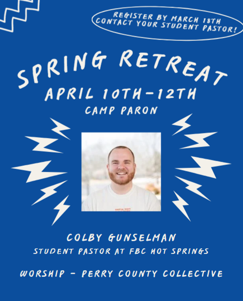 The speaker for the weekend will be Colby Gunselman, Student Pastor at FBC Hot Springs. Worship will be led by the Perry County Collective.